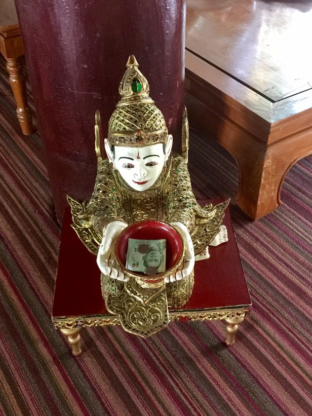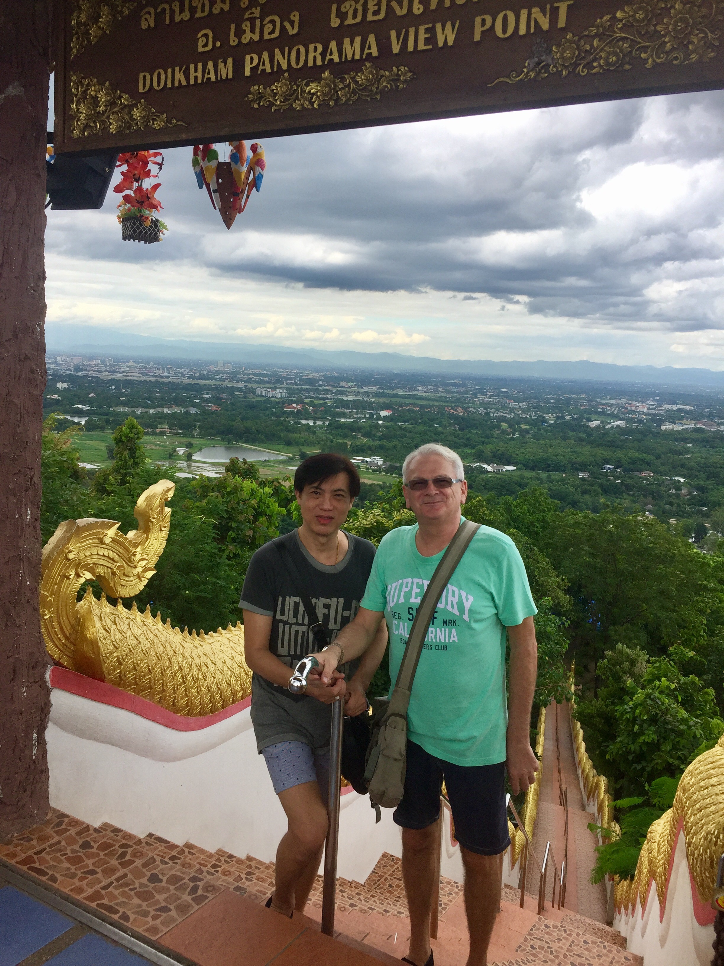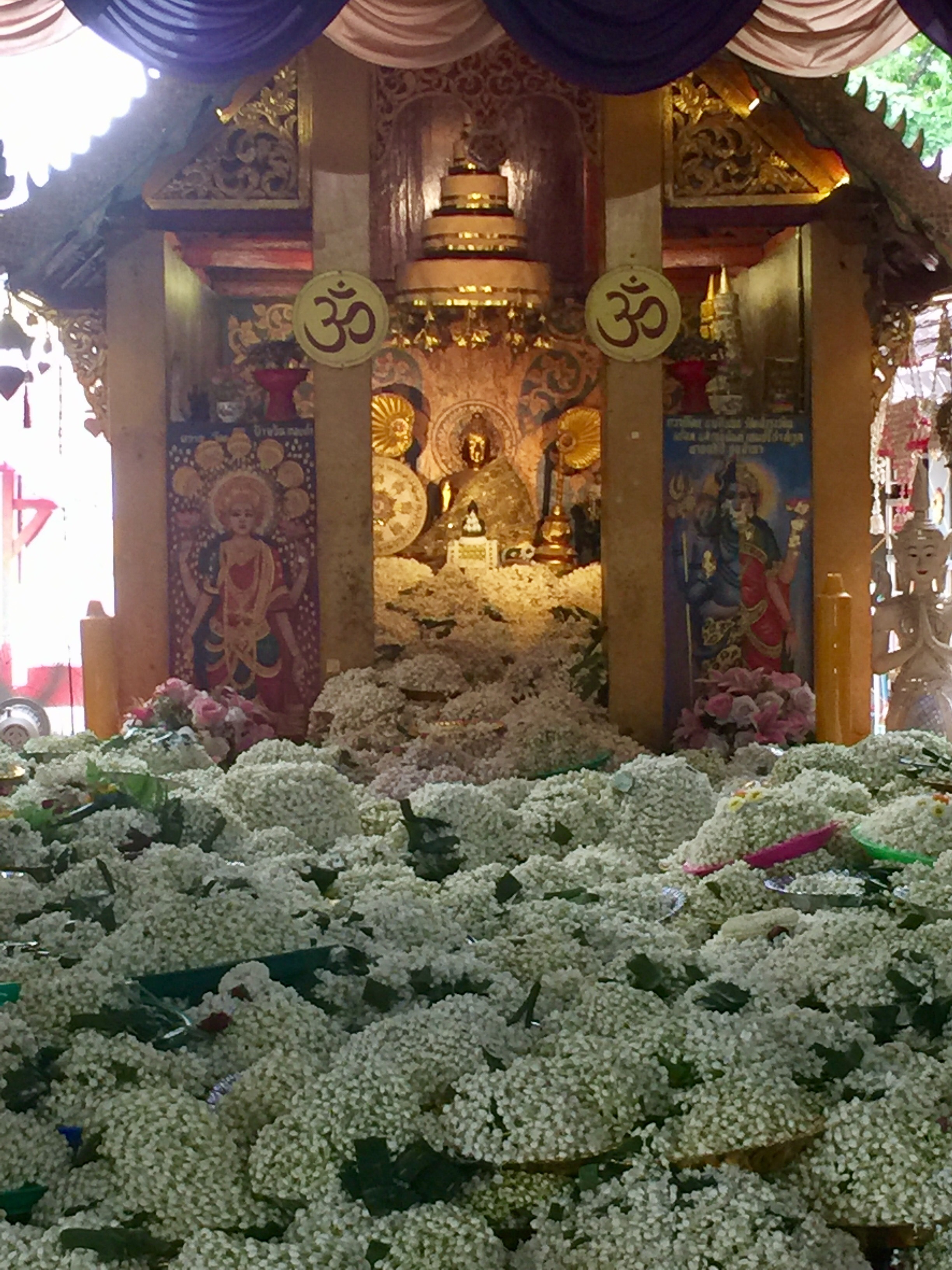 Huge golden colored Naga serpents guard the stairs on both sides of the pagoda that is enclosed by a gate. The chedi enshrines a sacred relic of the Buddha. A local legend tells about two giants who lived in the Doi Kham area thousands of years ago and who were said to be cannibals. When the Buddha visited the area he convinced the giants to give up cannibalism and convert to Buddhism. The Buddha gave them a relic of his hair, that is now enshrined in the temple’s chedi.