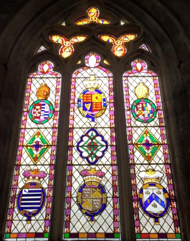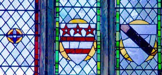 The Washington family coat of arms in 15th century stained glass at Selby Abbey, England