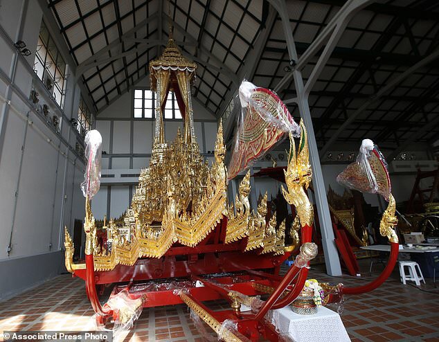 In this Sept. 8, 2017, photo, the royal chariot which will be used to carry the body and the royal urn of the late Thai King Bhumibol Adulyadej, is displayed at the National Museum.