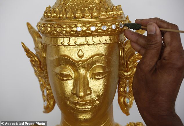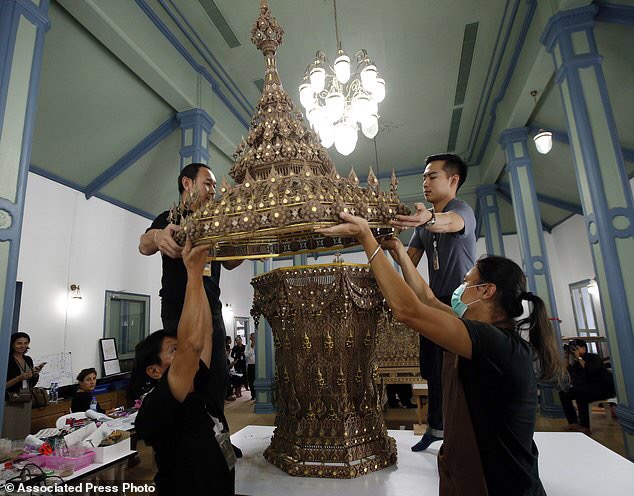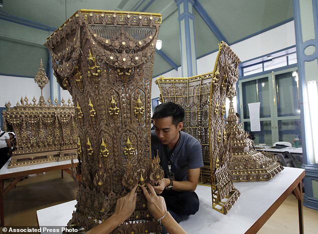 In this Sept. 8, 2017, photo, Thai artists install a royal urn made of sandalwood which will be used in the royal crematorium for the late Thai King Bhumibol Adulyadej. (AP Photo/Sakchai Lalit)
