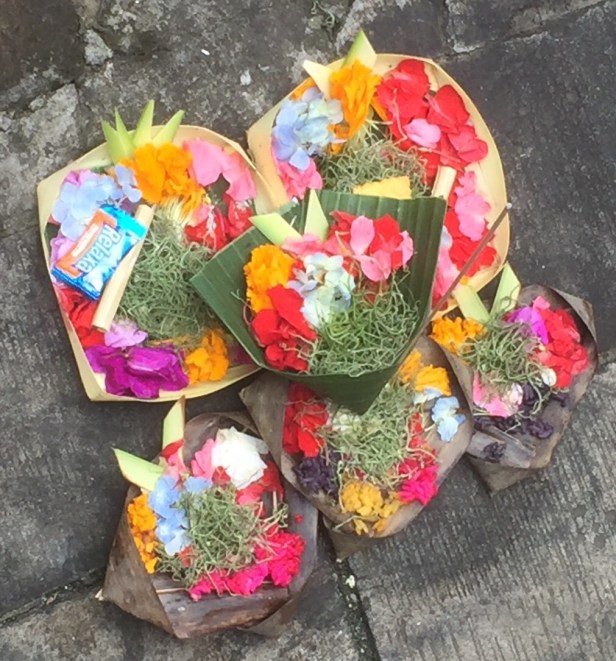 Daily you’ll see square trays filled with brightly coloured flowers lying on the ground or placed on objects. Made of palm leaves pinned together with bamboo sticks, they form a small flat square tray called a Canang Sari, they appear everywhere. They are offered in prayer to appease the gods and ward off evil spirits. Don’t step on them! It’s bad luck.