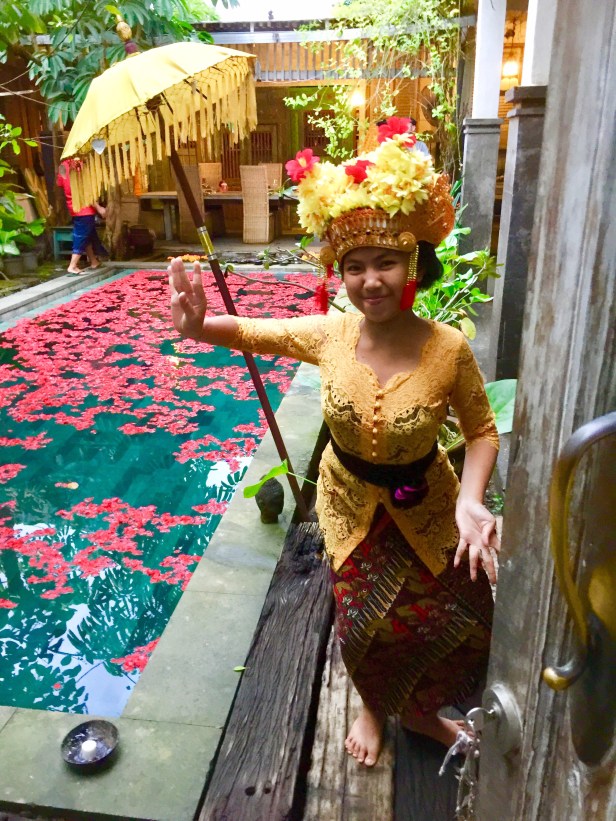 We arrived at her villa in Sanur after a 40 minute drive from the Indigo Hotel. We were met by the butler and ushered into a small private courtyard. We were greeted by a showering of rose petals and a Balinese dancer.